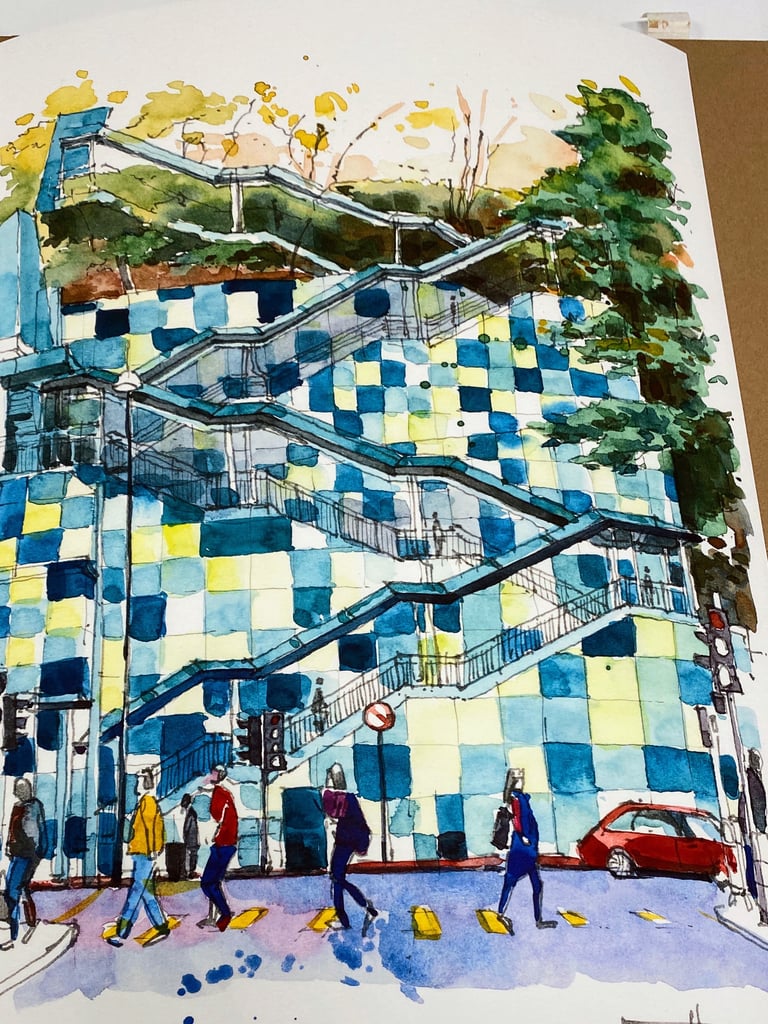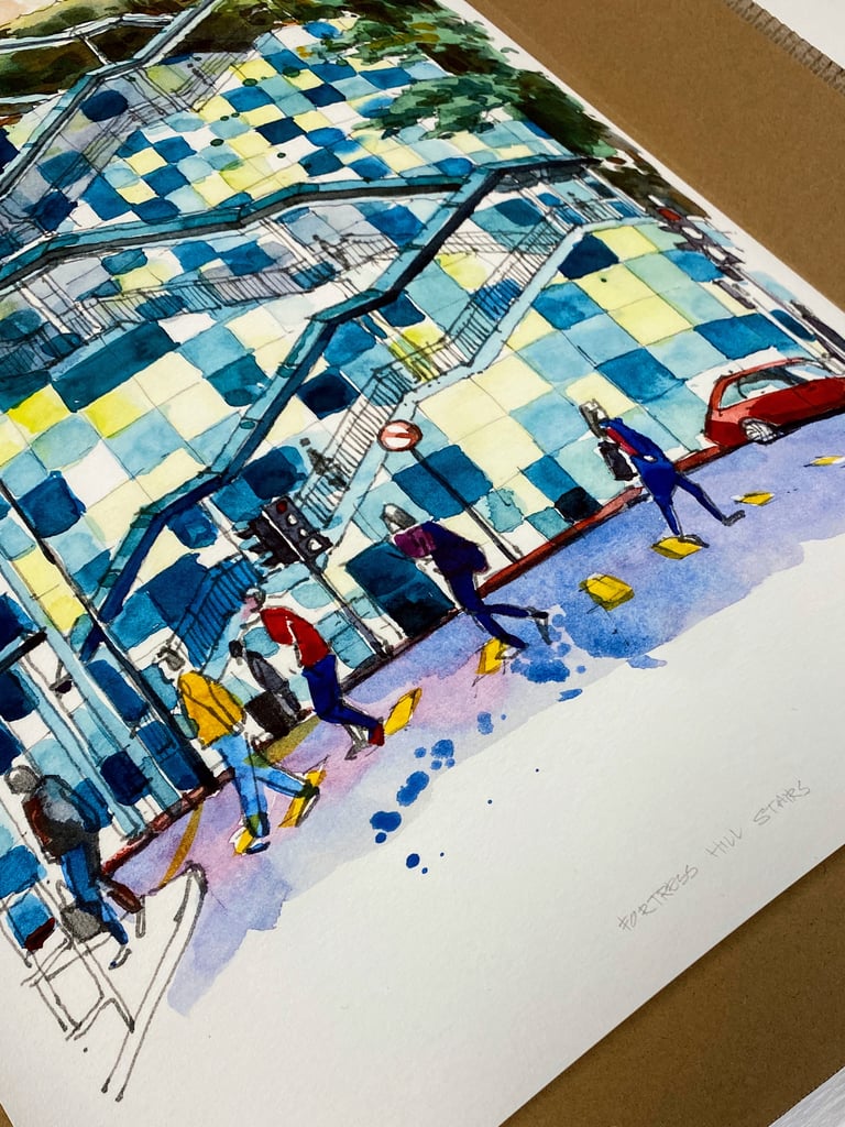 Fine Art Print of an ink and watercolour painting of the patchwork wall of the stairs and escalators next to Fortress Hill MTR station along King's Road.