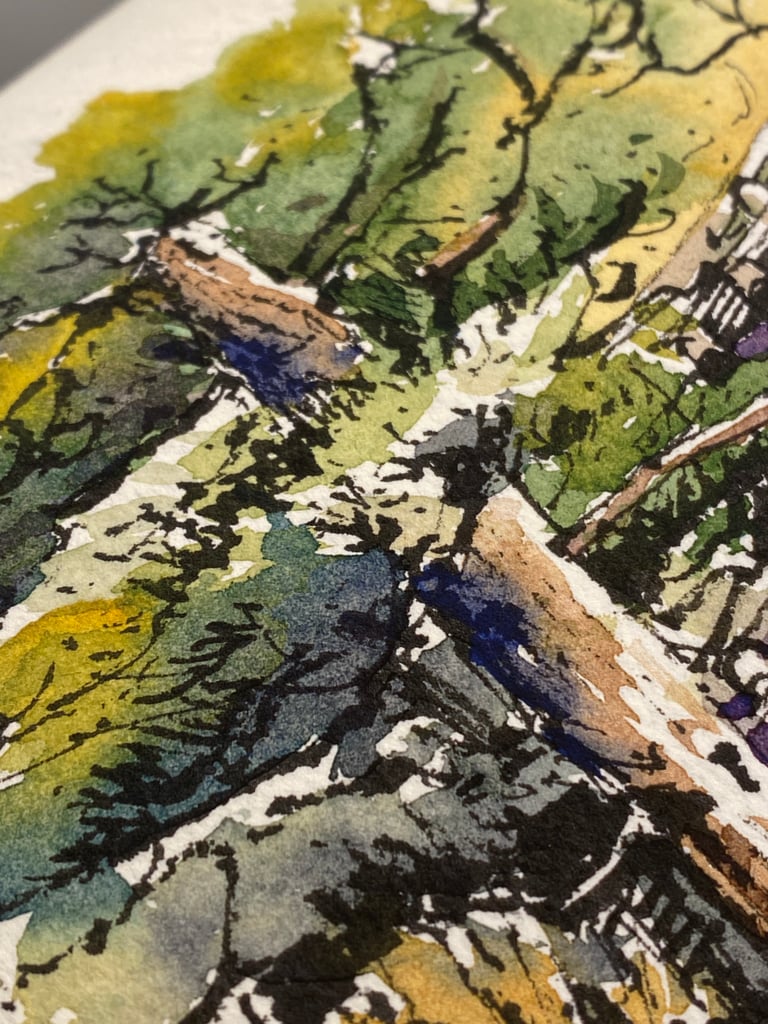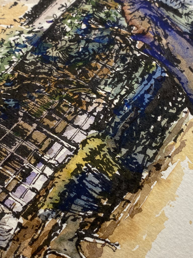 This painting was originally done with fountain pen and watercolour on handmade paper. It is one of 3 paintings I did on this subject based on photographs I took in a classical Japanese garden in Nara, Japan.
