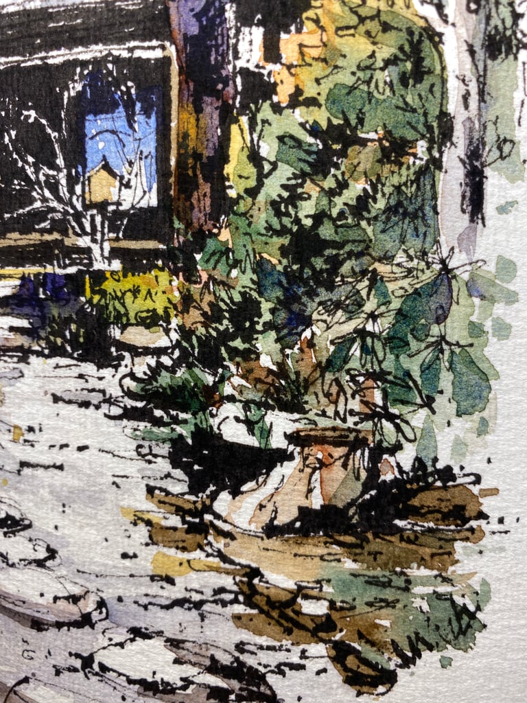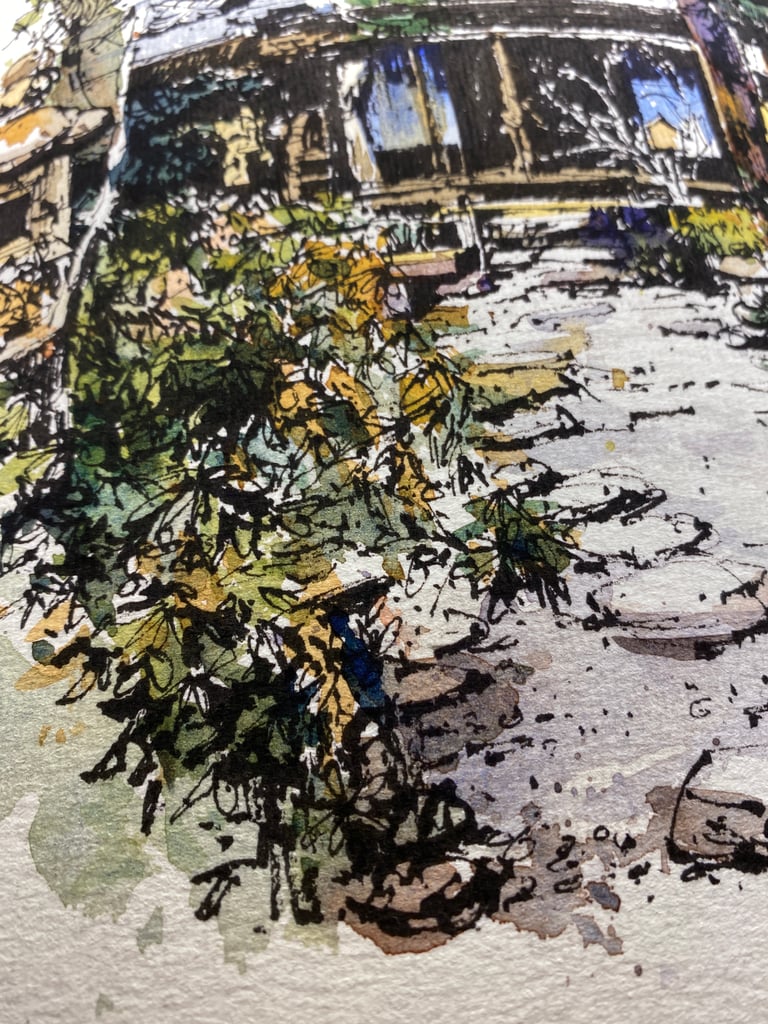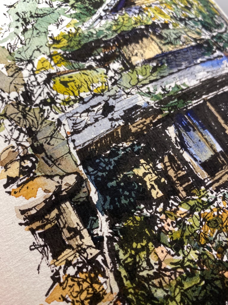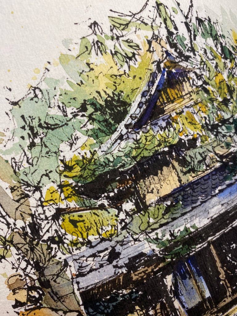 This painting was originally done with fountain pen and watercolour on handmade paper. It is one of 3 paintings I did on this subject based on photographs I took in a classical Japanese garden in Nara, Japan.