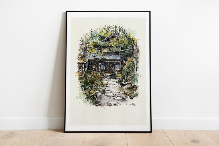 Fine Art Print of an ink drawing of a Japanese country house (minka) traditionally built with timber, straw and earth.