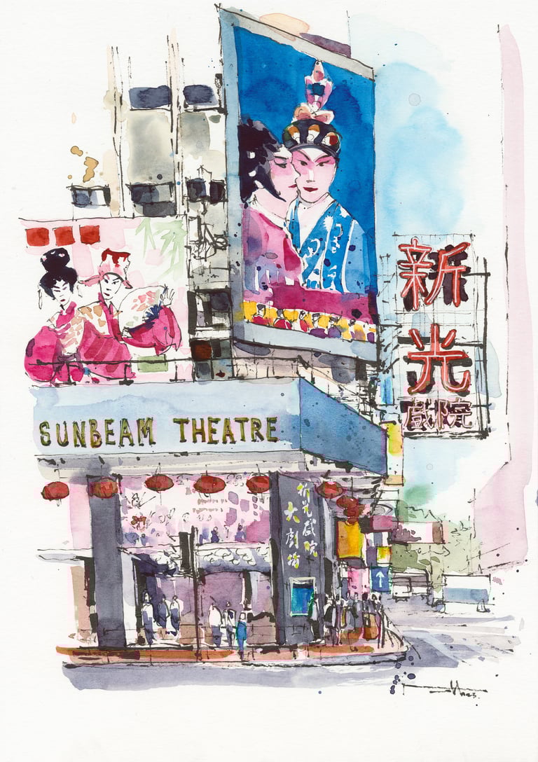 Original ink and watercolour painting of Sunbeam Theatre in North Point, Hong Kong.